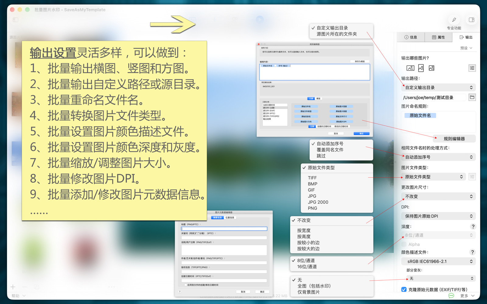 批量修改图片颜色描述文件、深度、透明通道、DPI等。