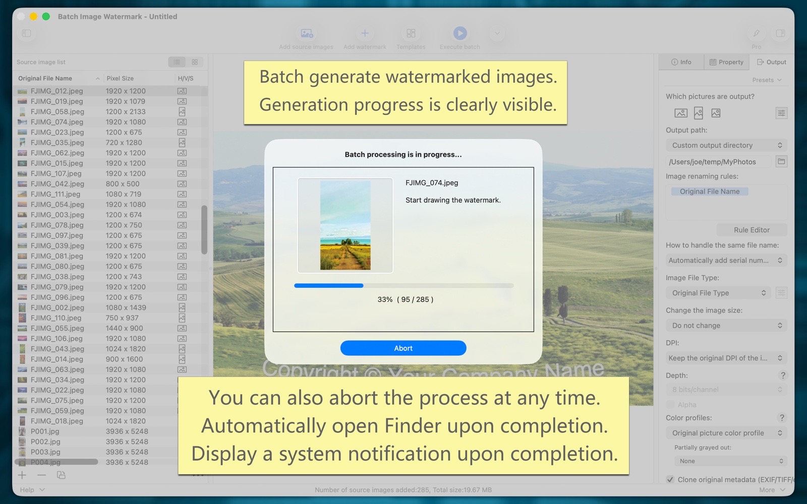 Moreover, "Batch Image Watermark" can also batch resize and scale images, batch convert image file types, batch modify image color profiles, batch add and edit image metadata, batch rename files, and batch set image color depth and color profiles, among other things. These features can be used individually or simultaneously. It is truly powerful and efficient.Main Function: