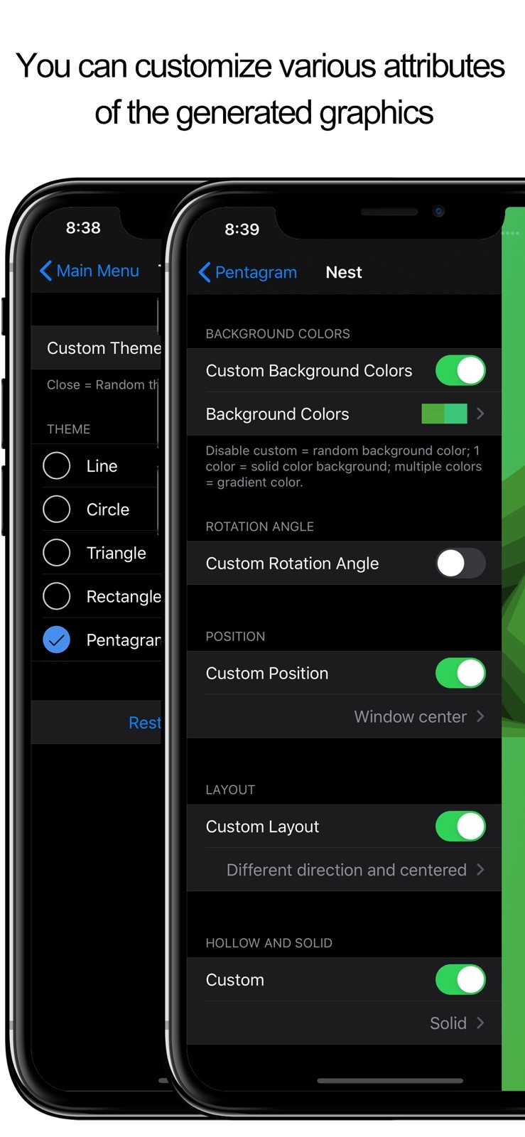 - In the custom mode, you can control the theme, style, background color, rotation angle, etc. of the generated geometric graphics, and set various detailed parameters of different graphics.