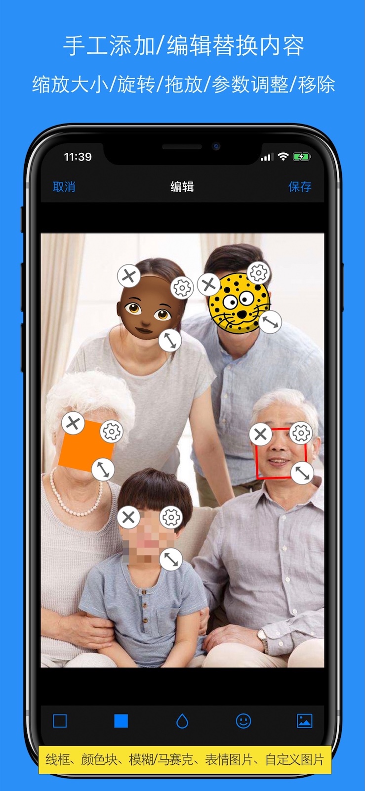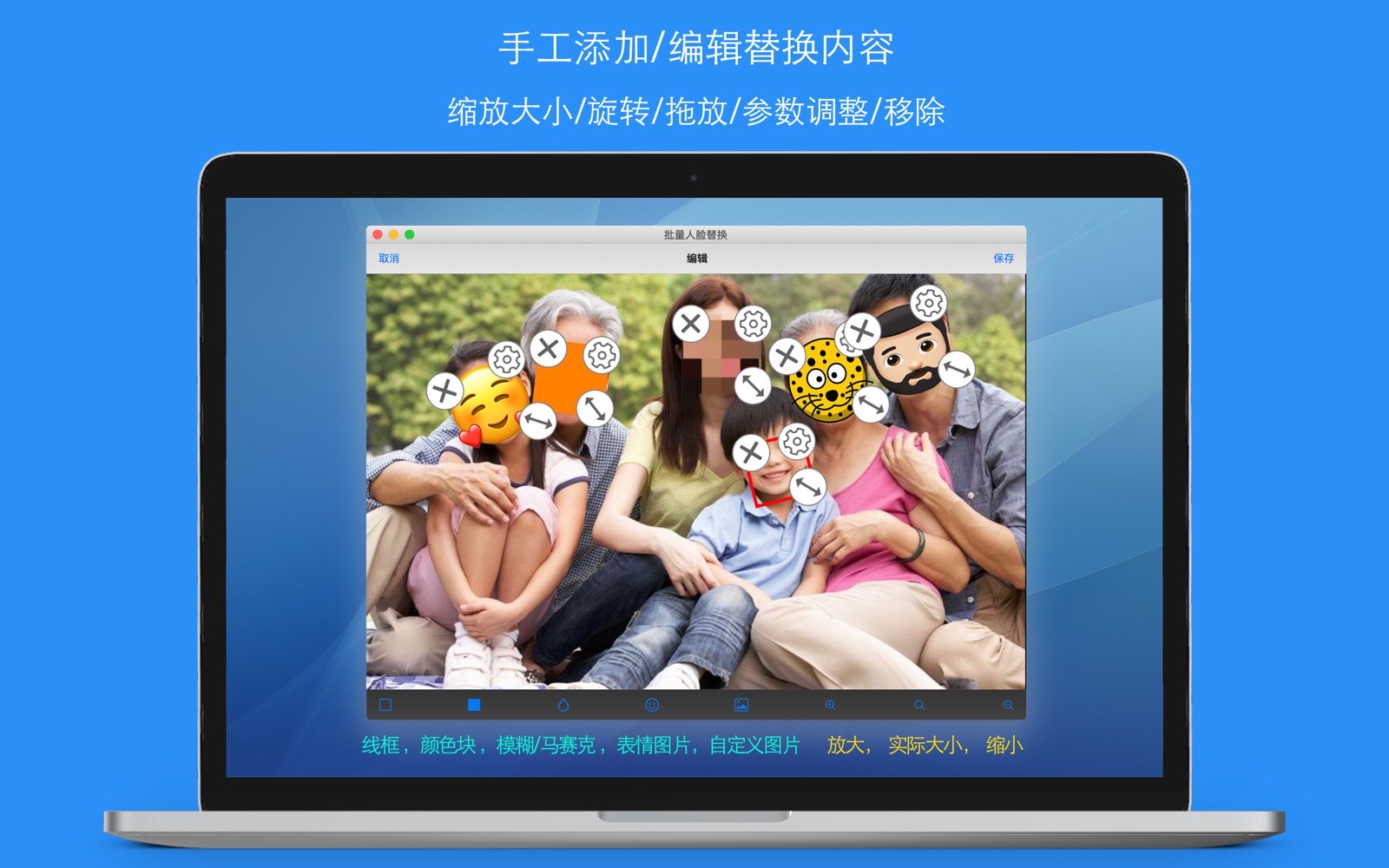 - 可以手工添加/编辑替换内容,并可以缩放大小、旋转、拖放、参数调整和移除。