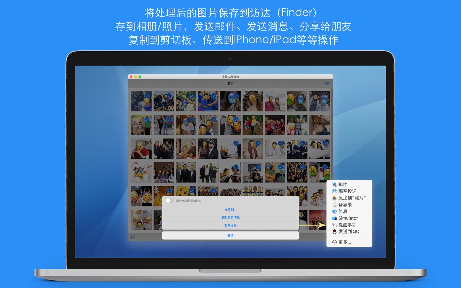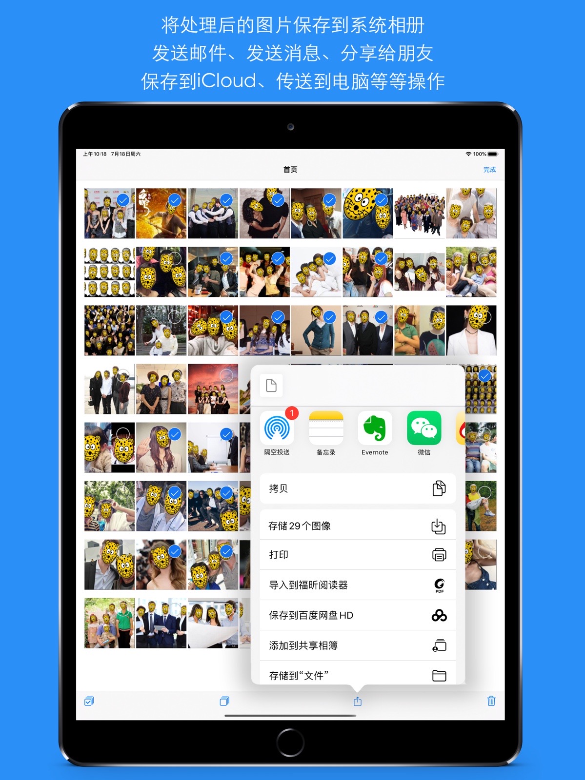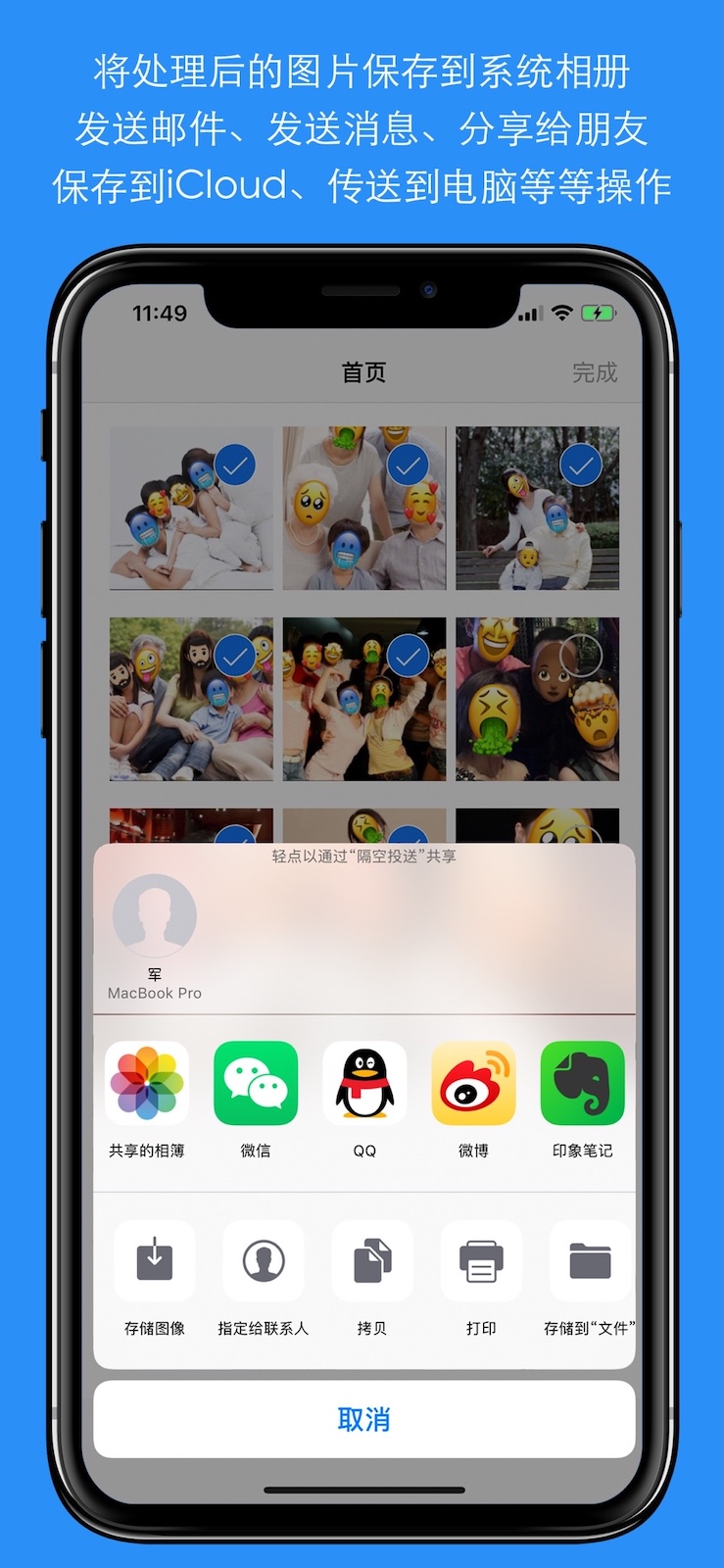 - 可以将处理后的图片保存到系统相册、发送邮件、发送消息、分享给朋友、传送到电脑、保存到iCloud共享相簿、打印,等等操作。