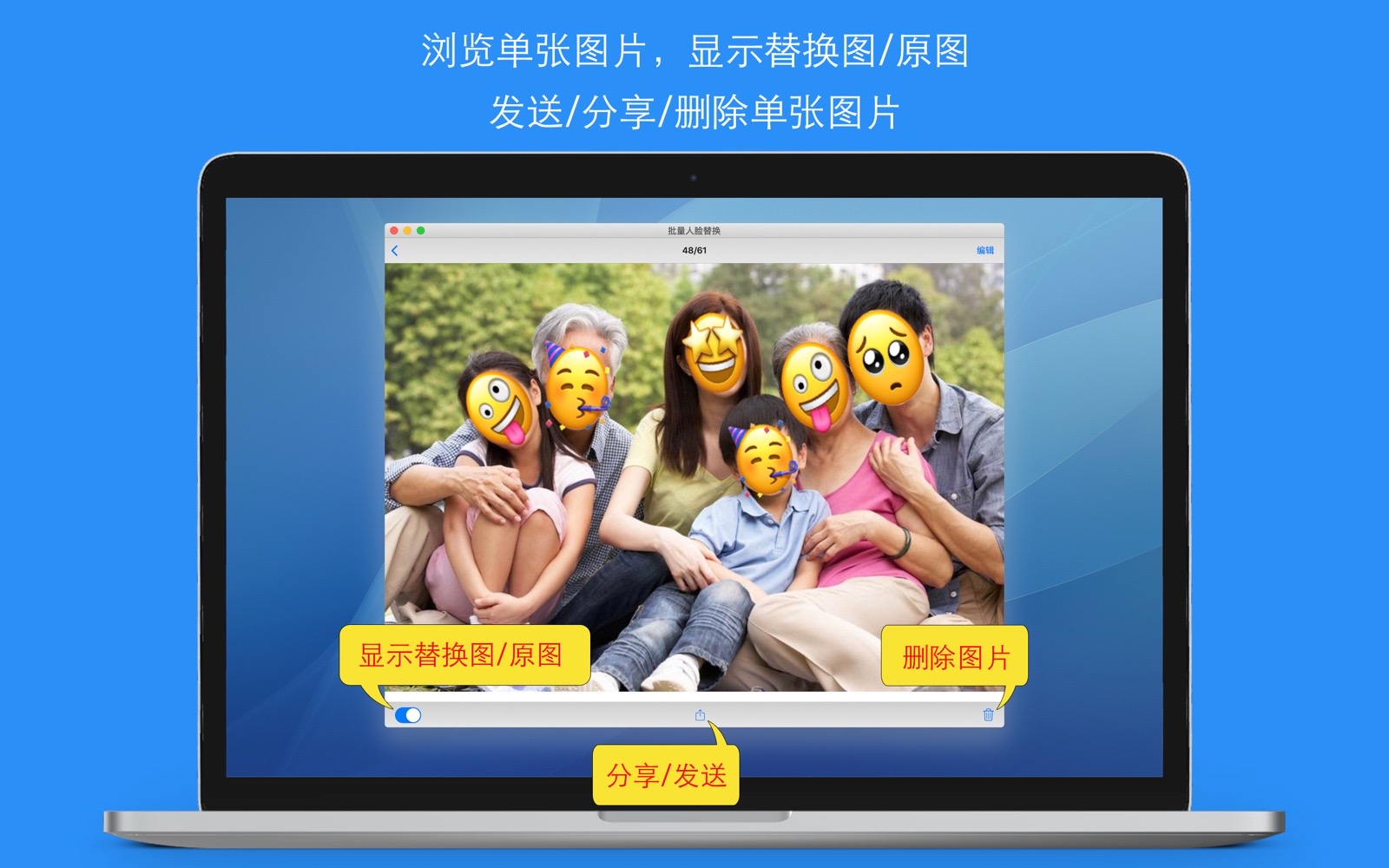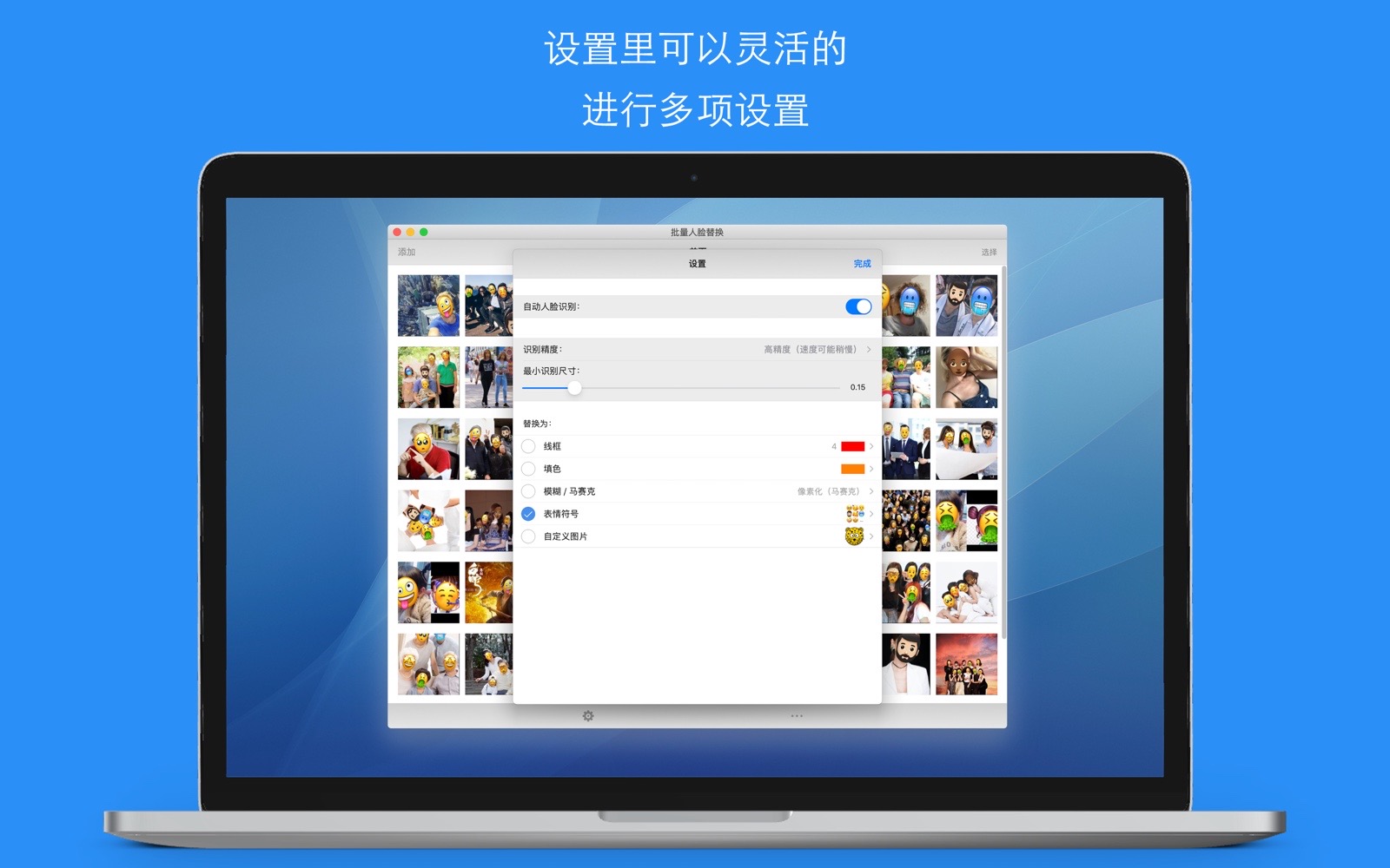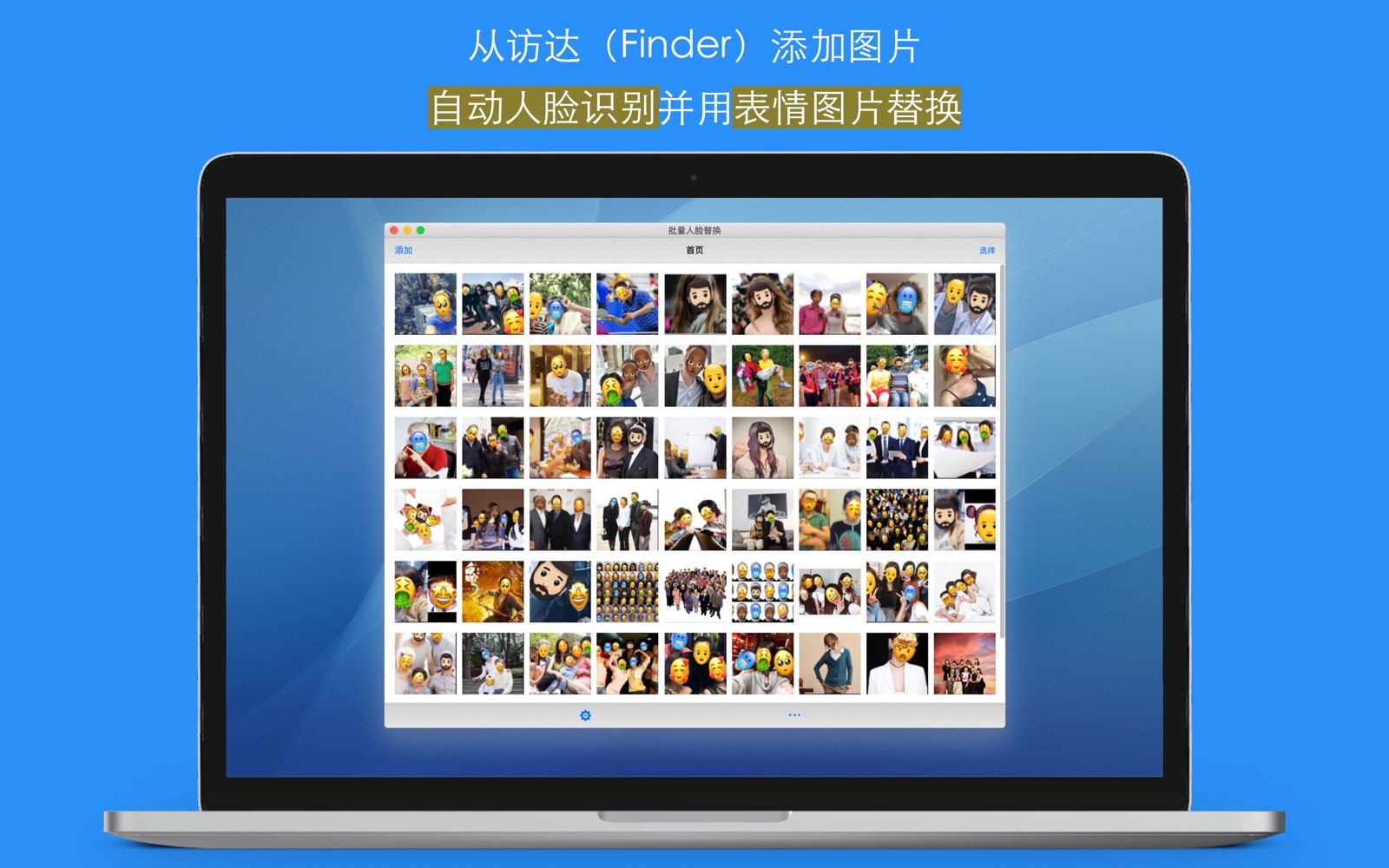 有时候,您拍照了很多照片,您希望保留部分隐私的同时(不暴露面孔),又能分享这些照片到朋友圈或社交网络,而且能够批量、快速地处理这些照片,那么,“批量人脸识别替换”这个应用程序将很好的满足了您的需要。
