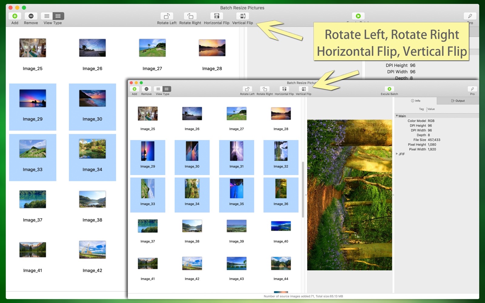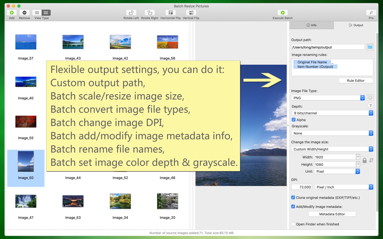 "Batch Resize Pictures" can conveniently and quickly resize a large number of images, either enlarging or reducing them. Additionally, it can batch convert image file types, batch modify image color profiles, batch add and edit image metadata, batch rename files, batch set image color depth and color profiles, batch modify image DPI, and more. These functions can be used individually or simultaneously, all in one step, maximizing efficiency. It is both easy to use and professional, making it a great assistant for your work.