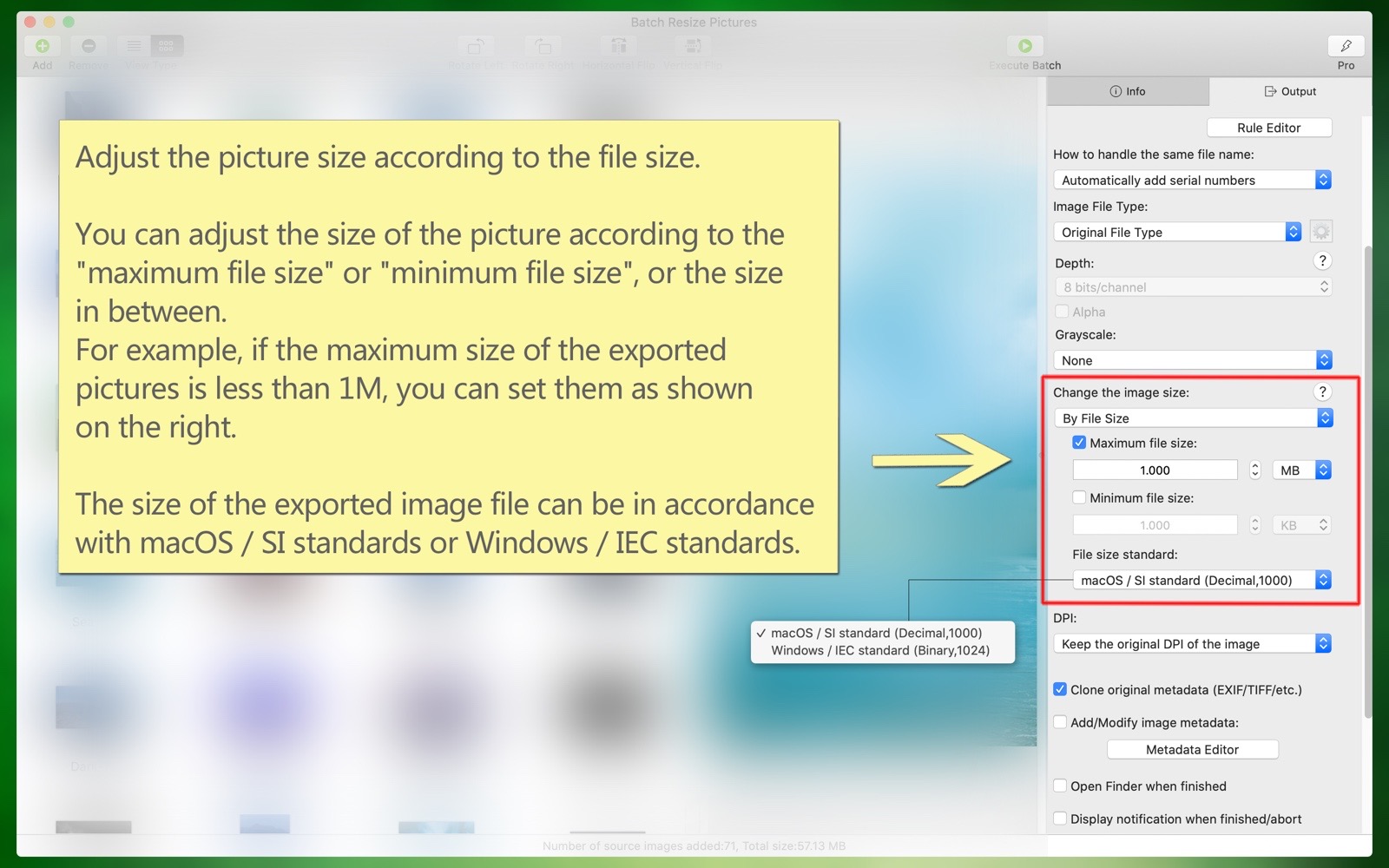 (4) The image size can be adjusted according to the file size. The image size can be adjusted based on the 'maximum file size' or 'minimum file size', or a size in between. The exported image file size can follow macOS/SI standards or Windows/IEC standards. - Common design image sizes can be referenced, such as: various ID photo sizes, printing-related sizes like A4, B5, etc., posters, postcards, various web sizes, and sizes for devices like iPhone, iPad, Android, etc.