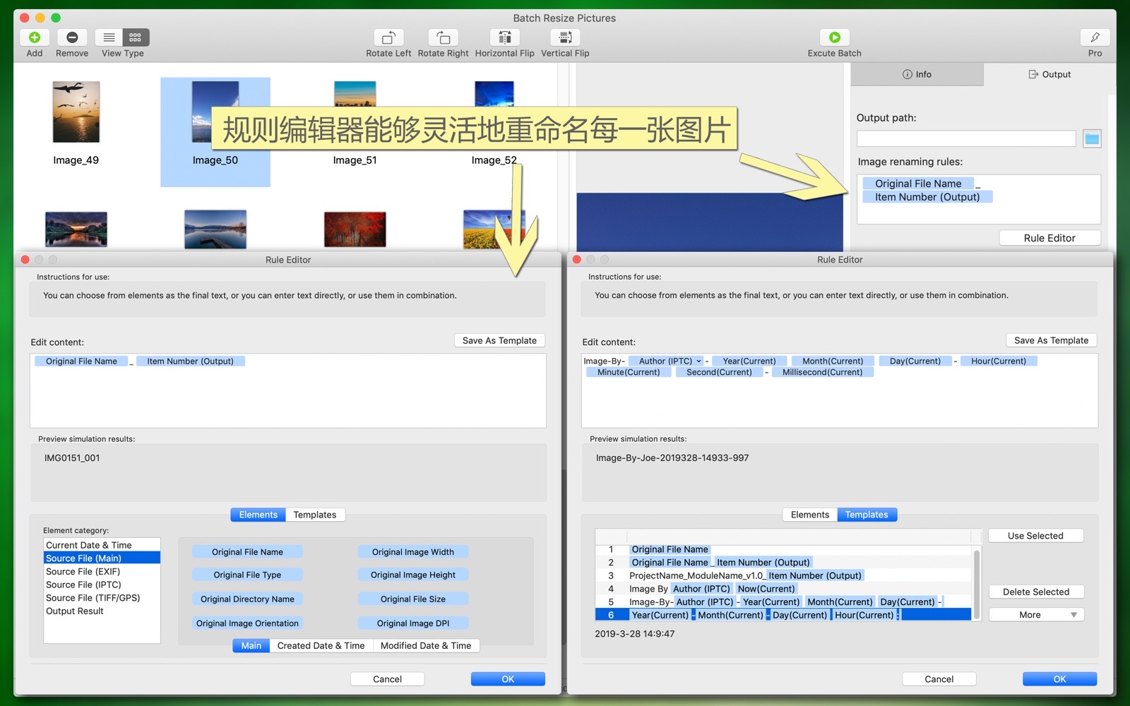 - Batch rename or customize the output image file names, which can be generated dynamically (based on time, EXIF, sequence number, templates, and other information).