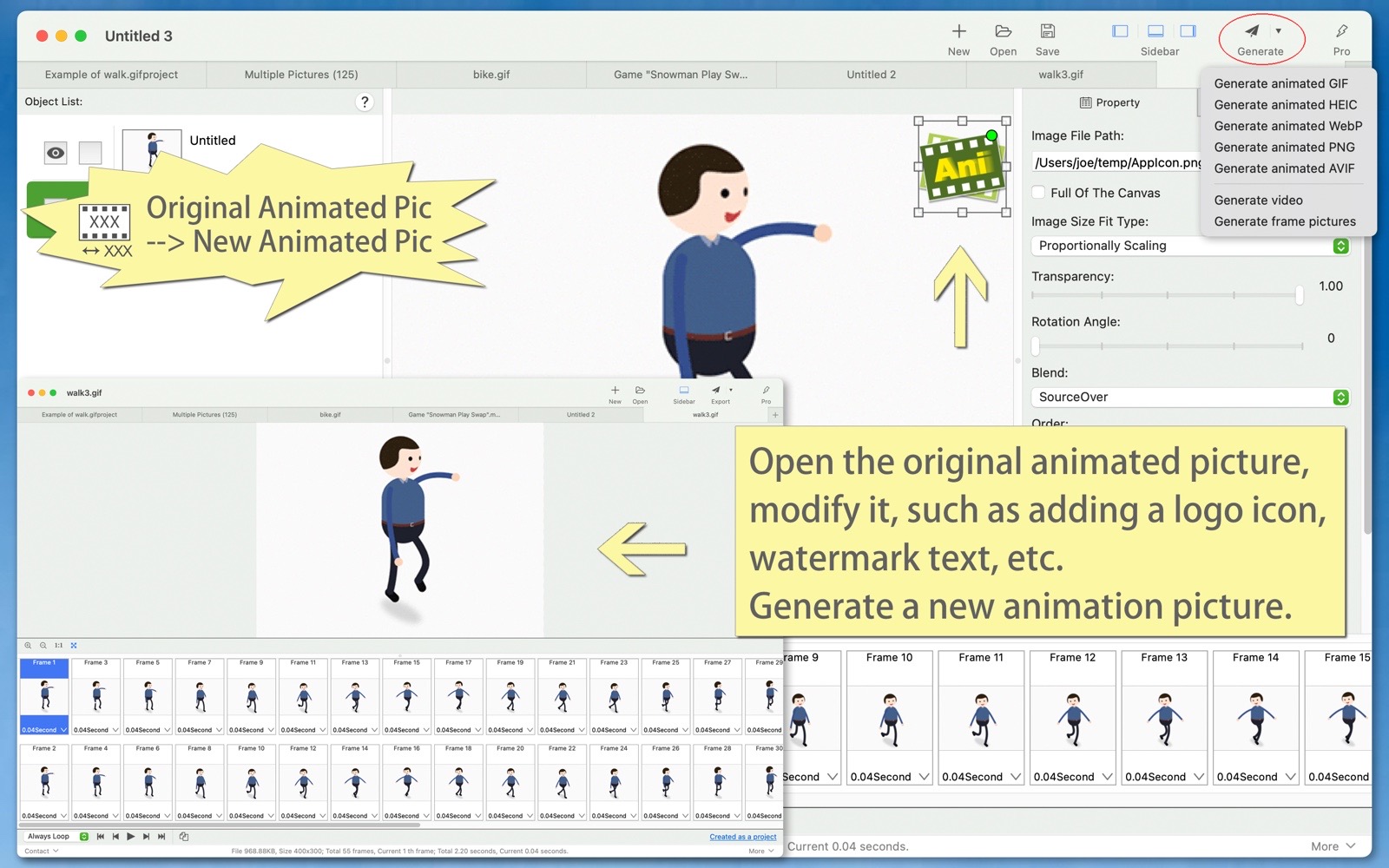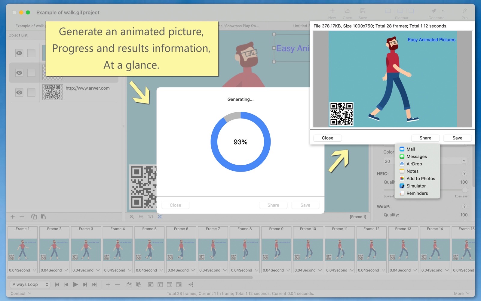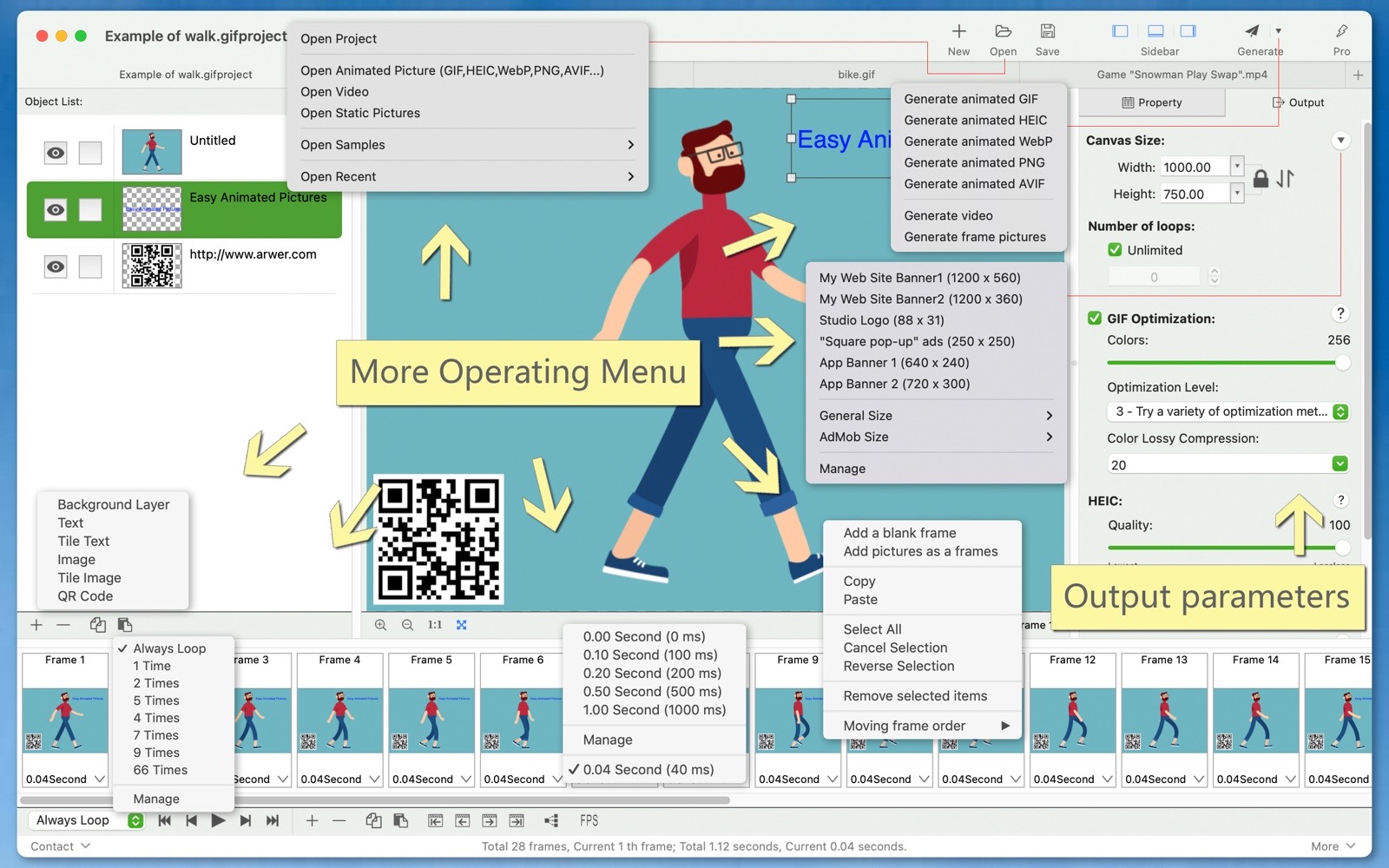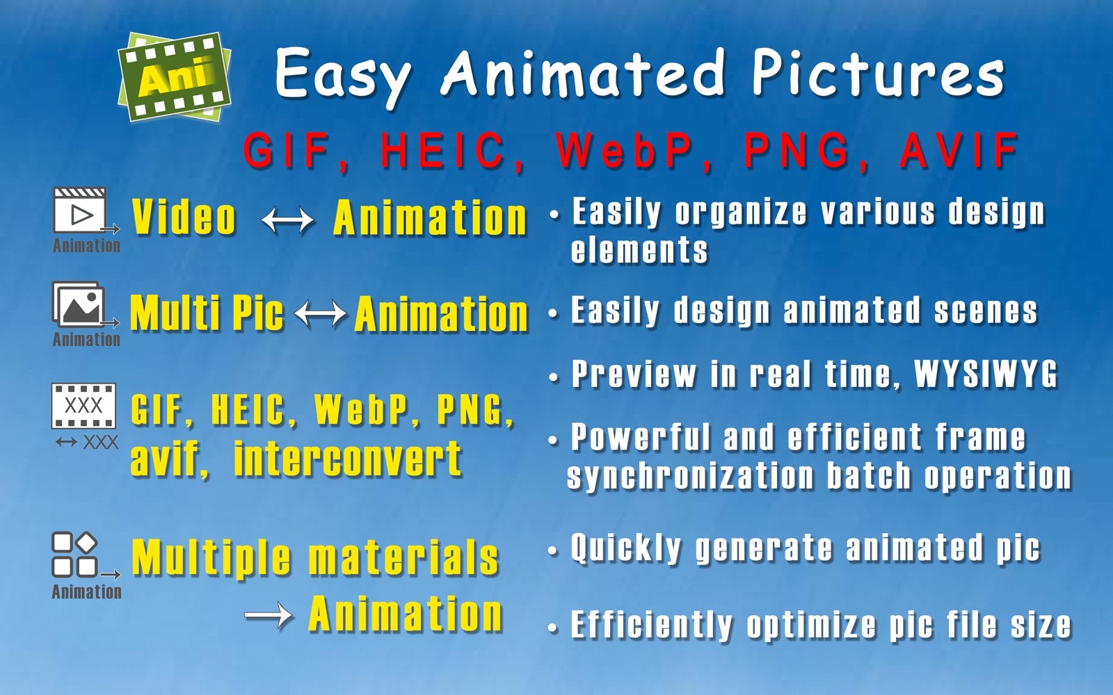 "Easy Animated Pictures" can conveniently organize various design elements, easily create animated scenes, preview in real-time with a WYSIWYG experience, quickly generate animation image files (GIF, HEIC, WebP, PNG, AVIF...), as well as video files. It can efficiently optimize the size of animation files.