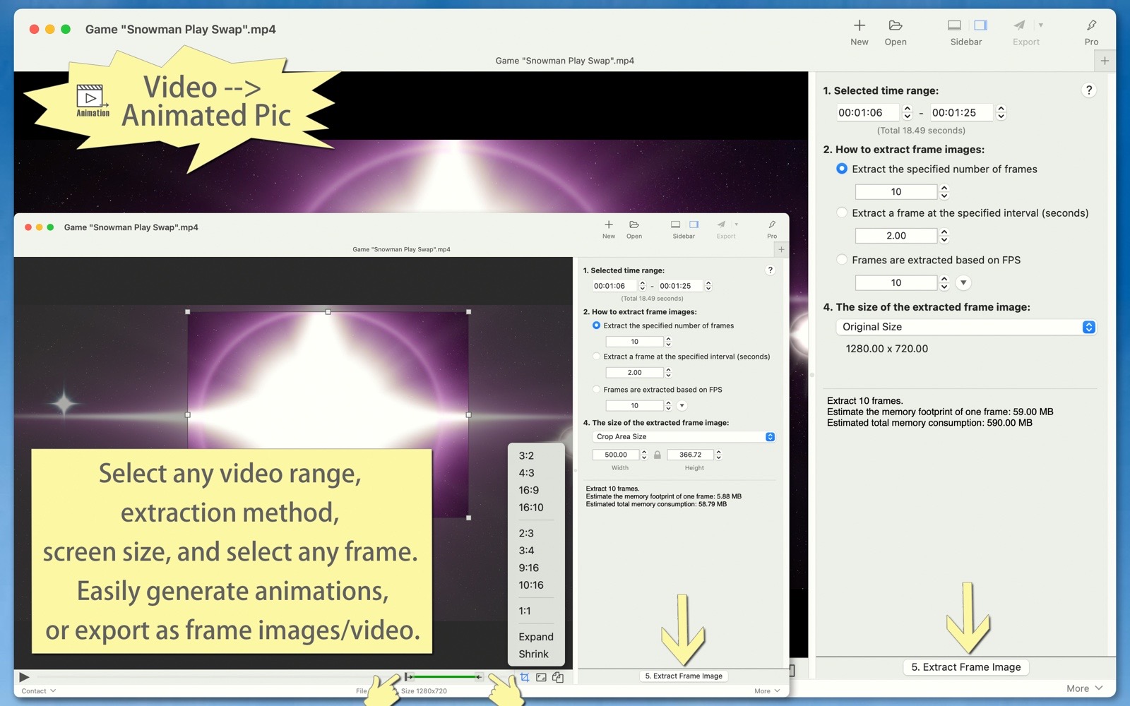 (2) Convert video to an animated image. You can select the video time range, set the extraction method, and adjust the frame size, etc.