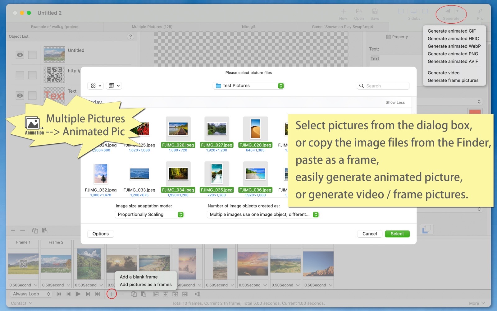 (1) Generate an animated image from multiple static images. You can set the image adaptation method: scale proportionally, stretch, or crop.