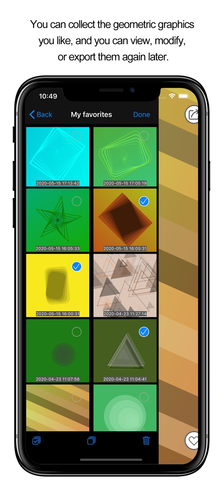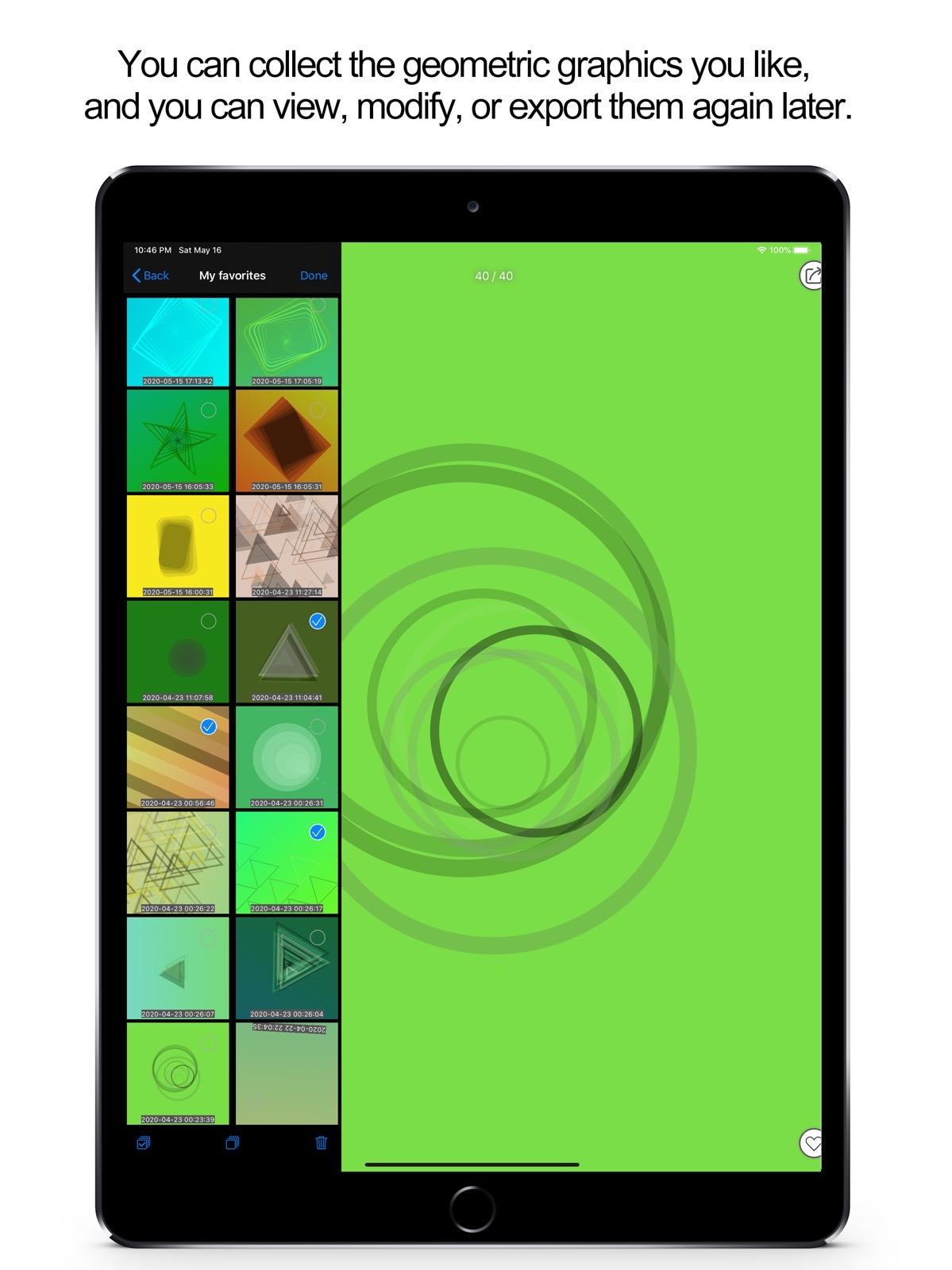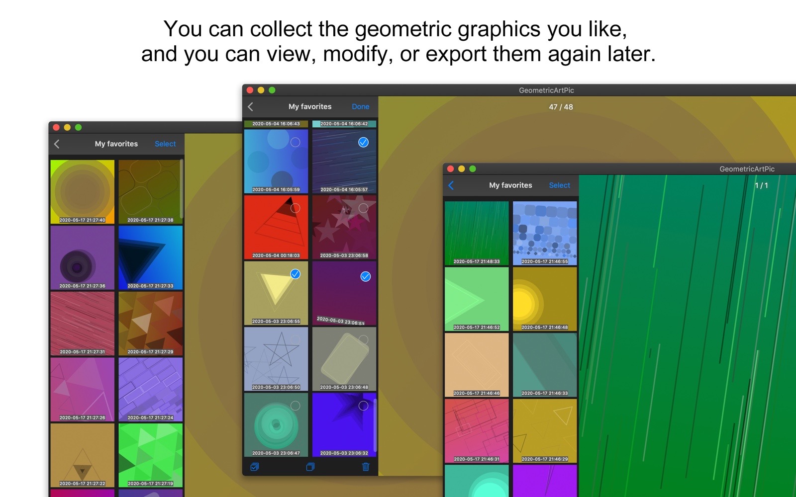 - You can collect the geometric graphics you like, and you can view, modify, or export them again later.
