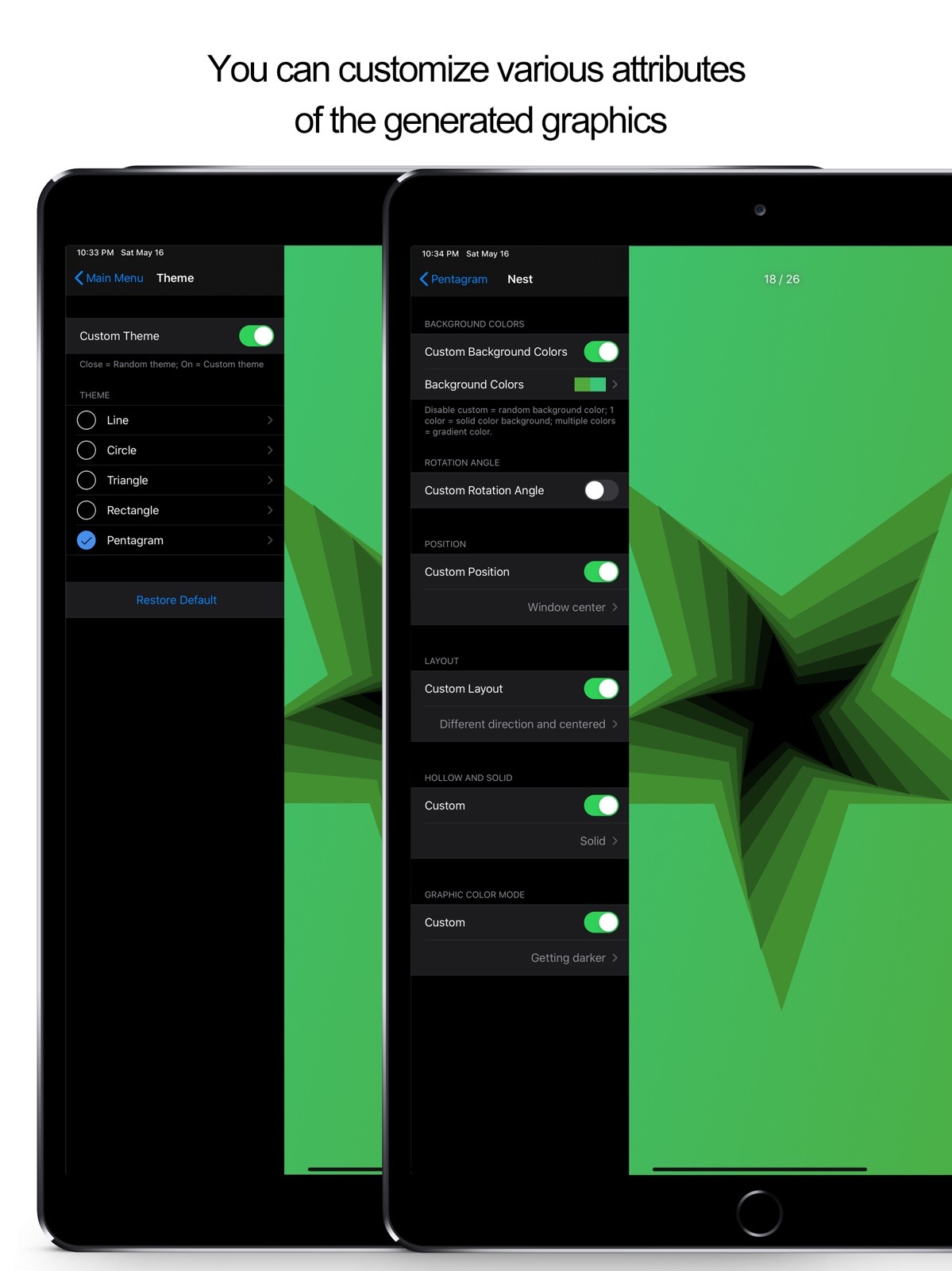 - In random mode, powerful algorithms ensure that you can create distinctive graphics / patterns every time.