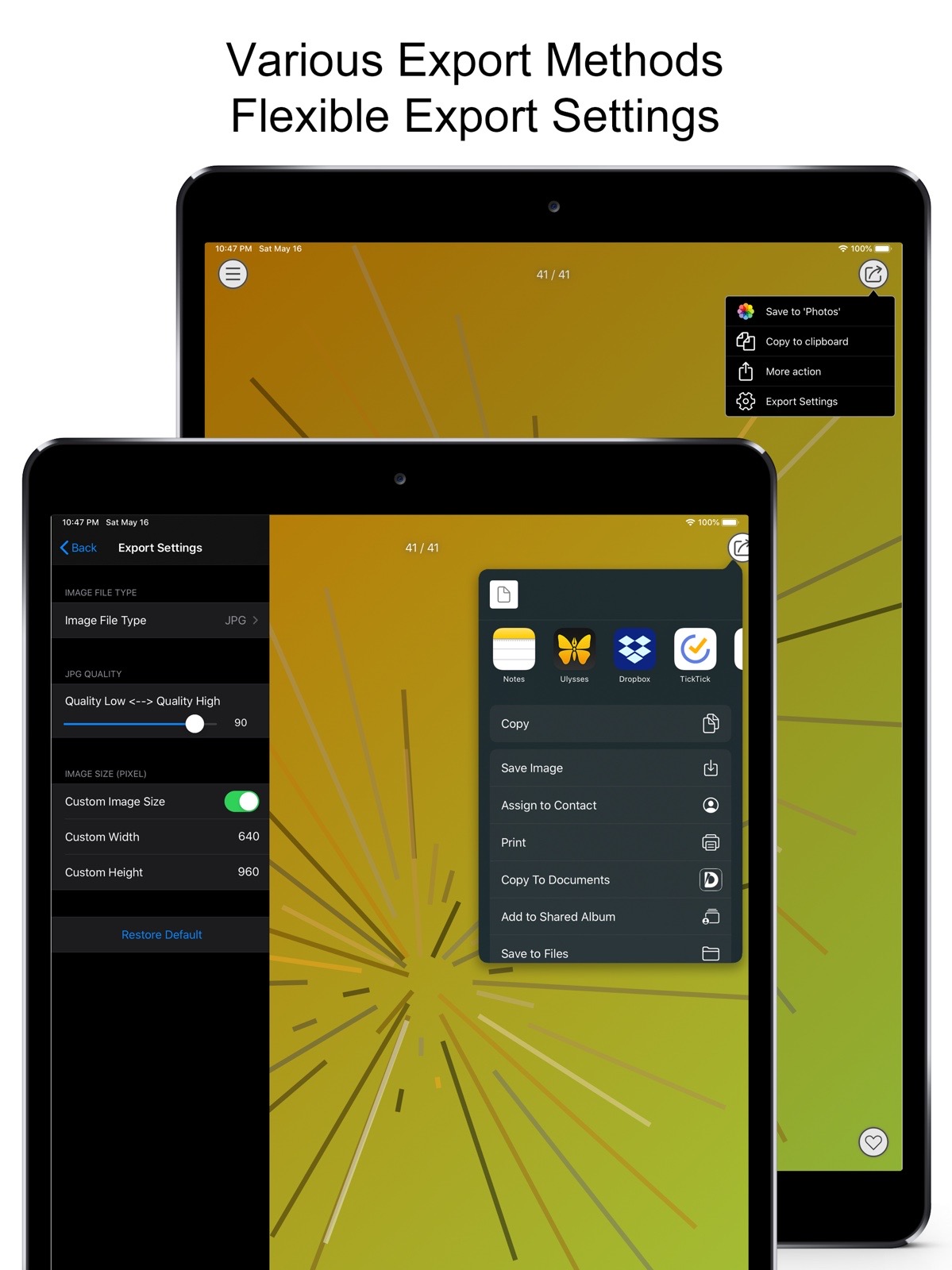 You can set various sizes of exported pictures (various common sizes, or custom width/height), pictures in multiple formats (such as JPG/PNG/BMP/TIFF, etc.), and so on. - The application supports multiple operating systems including iOS, iPadOS, and macOS. In-app purchases are valid across all supported platforms with a single purchase, eliminating the need for additional purchases.