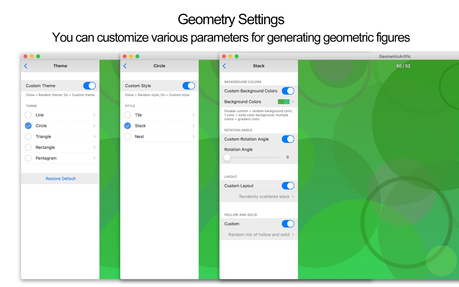 - In the custom mode, you can control the theme, style, background color, rotation angle, etc. of the generated geometric graphics, and set various detailed parameters of different graphics.