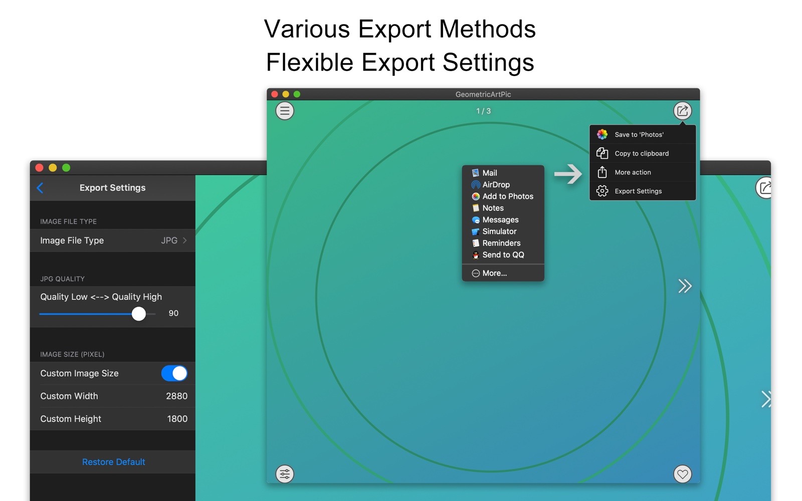 - You can export the geometry as a picture, save it to the system "Photos", save it to the specified directory, copy it to the clipboard, share it with friends, etc.